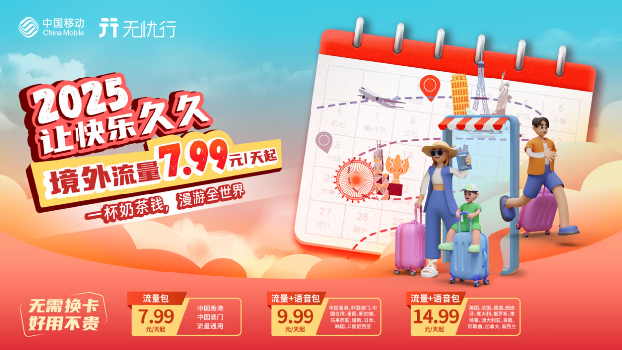 在這左右為難之際,小伙伴們,何不換一種視角,去探索一個更優(yōu)的選擇?無需換卡換號,也無需占用行李空間,國內(nèi)運營商的國際漫游流量包,為你打造暢游網(wǎng)絡世界的通行證。還有超值福利等你來享,助你沉浸式體驗旅行本身的樂趣。以中國移動為例,目前,中國移動國際/港澳臺漫游已覆蓋全球200多個國家/地區(qū),提供多種流量套餐,包天不限量/限量不限速多種方式供你選擇,線上渠道輕松購買,不用換卡換號,落地即可激活,讓你隨時隨地享受高速穩(wěn)定的網(wǎng)絡體驗和服務,旅途的每一刻都松弛感滿滿!