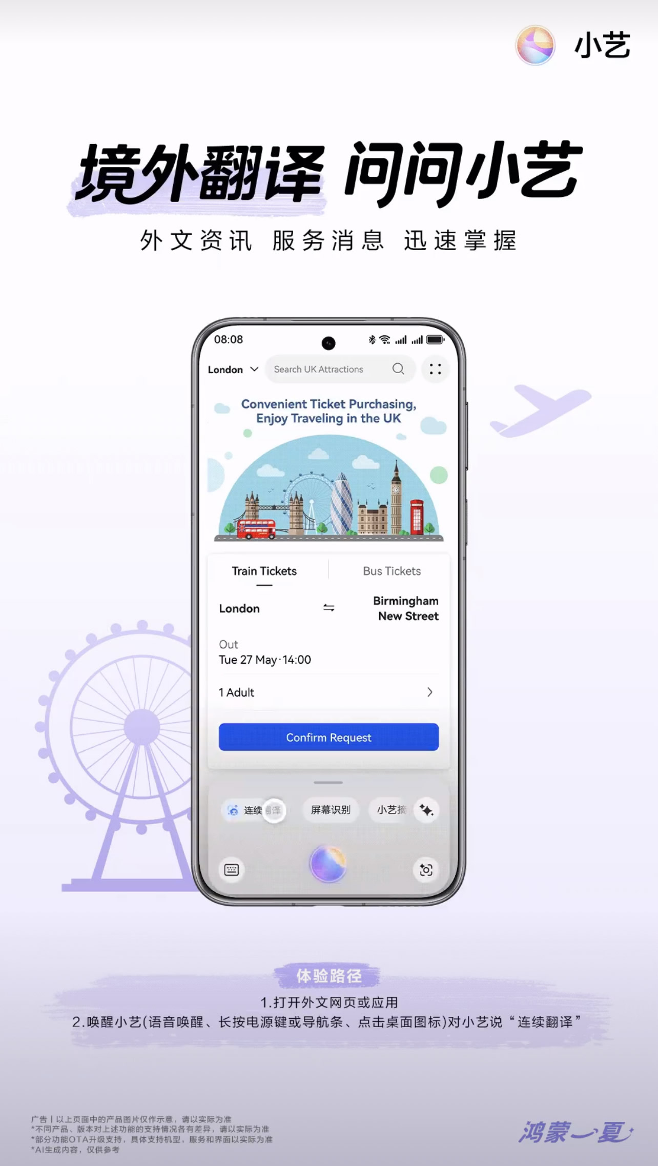 境外游時,難免遇到瀏覽當(dāng)?shù)鼐W(wǎng)站訂票、打車時卻發(fā)現(xiàn)根本看不懂的麻煩。升級到鴻蒙 5.1的用戶這時就可以用小藝“連續(xù)翻譯”功能解決。長按小藝導(dǎo)航條,點擊“連續(xù)翻譯”服務(wù)即可體驗,一次開啟就能實現(xiàn)屏內(nèi)邊瀏覽邊翻譯的系統(tǒng)級連續(xù)翻譯體驗,支持截屏、文檔、瀏覽器等全場景的連續(xù)性翻譯。