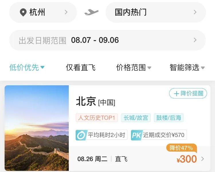 8月7日,記者查詢第三方售票平臺發(fā)現(xiàn),8月26日杭州飛北京經(jīng)濟艙機票價格僅需300元(不含稅),相當于打了1.3折。8月13日,杭州飛揭陽經(jīng)濟艙票價最低僅需370元(不含稅),相當于打3.1折。8月27日,杭州出發(fā)飛石家莊票價最低僅需330元(不含稅),相當于打2折。