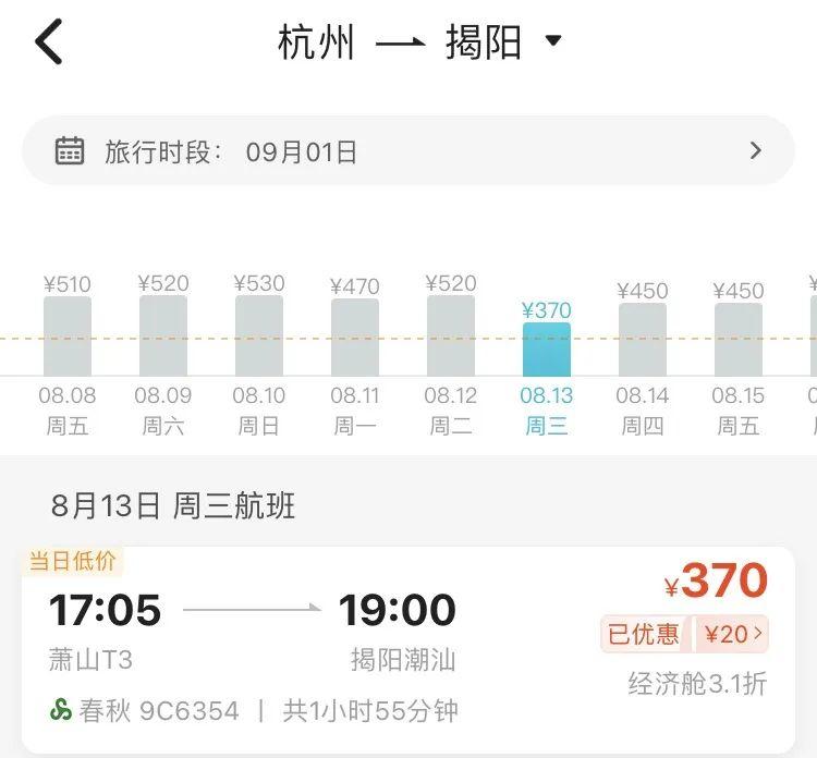 8月中旬,寧波飛廣州、揭陽的機票價格2字頭就可拿下,比如8月13日寧波飛廣州最低票價僅需279元(不含稅),8月12日寧波直飛揭陽機票價格最低僅需290元(不含稅)。