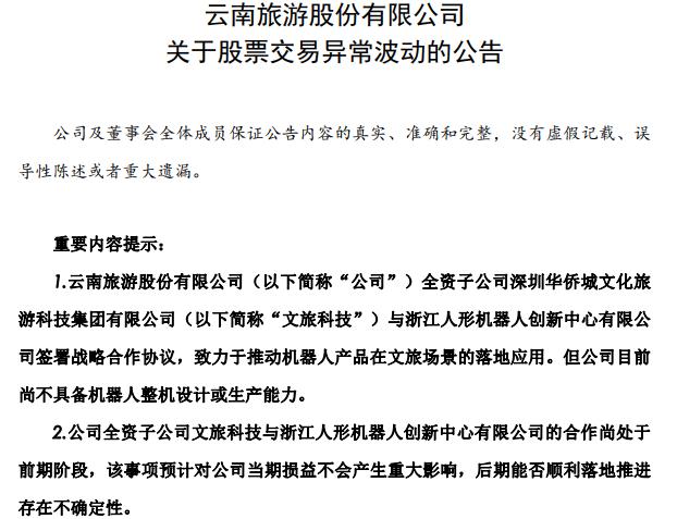 根據云南旅游22日盤后發(fā)布的異動公告,目前,雙方合作尚處于前期階段,該事項預計對公司當期損益不會產生重大影響,后期能否順利落地推進存在不確定性。另外,公司目前尚不具備機器人整機設計或生產能力。
