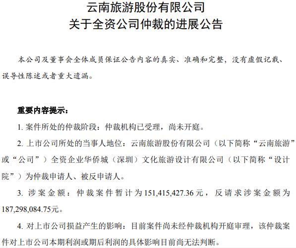 公司在今年2月發(fā)布公告,海力控股集團有限公司與公司的全資公司云南旅游汽車有限公司所屬全資公司云南云旅交通投資開發(fā)有限公司發(fā)生合同履行糾紛,海力控股就該合同糾紛向昆明市中級人民法院提起訴訟。因云旅交投認為海力控股存在違約,對案件提起反訴。近日,公司收到昆明中院出具的《民事判決書》,判決由云南云旅交通投資開發(fā)有限公司支付海力控股集團有限公司工程款1.18億元及預期利息等。