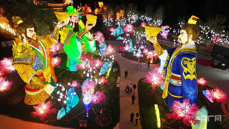 “快看,涿水女神在眨眼!”孩童驚呼引來眾人駐足。運用動態(tài)LED技術(shù),絹紗背后的女神眼眸流轉(zhuǎn),讓古老傳說瞬間鮮活。12米的“桃園三結(jié)義”燈組搭配實景情景劇,讓“三國演義從涿州開篇”的故事跳出書本。盧植、酈道元等先賢燈廊下,游客們借著暖光,細細品讀他們的生平,風過廊下,燈影輕搖,宛如歷史在耳邊回響。