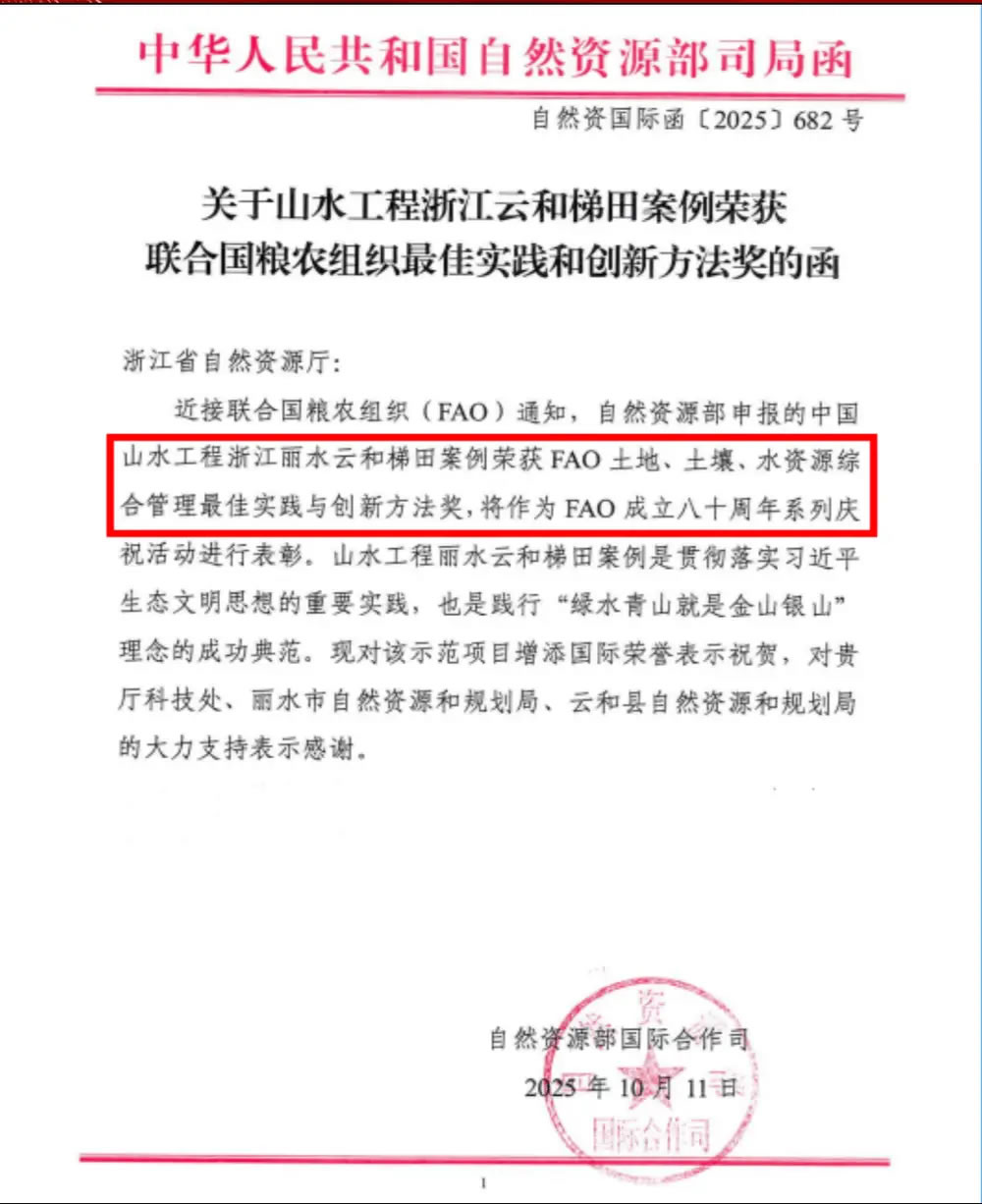近日,中國山水工程浙江云和梯田項目榮獲聯(lián)合國糧農(nóng)組織最佳實踐和創(chuàng)新方法獎,并將作為聯(lián)合國糧農(nóng)組織(FAO)成立八十周年系列慶;顒舆M(jìn)行表彰。